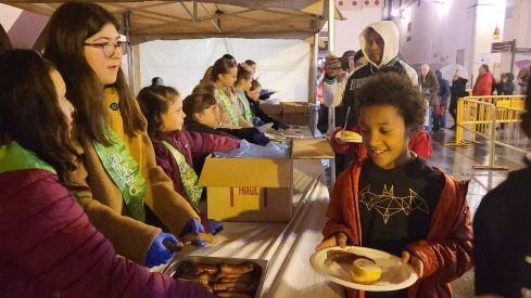 Las mairalesas infantiles y mayores y miembros de la corporación han participado en el reparto de 85 kilos de longaniza y 30 de chorizo, que se han acompañado de pan, agua y vino. También se ha colocado un puesto con productos para celiacos.