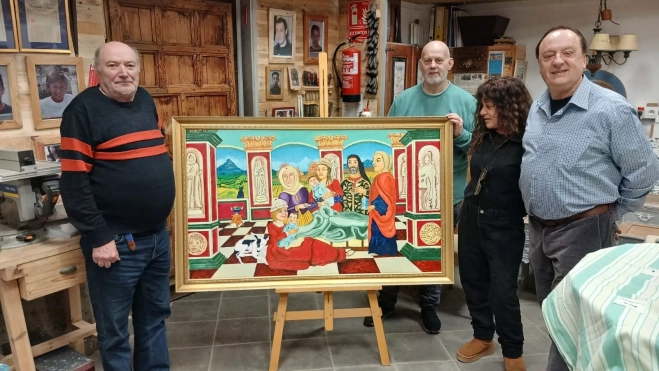 "En el cuadro he buscado que se reconozca Huesca, no solo en el paisaje, sino también en las personas. Algunos personajes están inspirados en caras conocidas, amistades de toda la vida, que me ayudaron a dar cercanía y verdad a la escena. Para mí era importante que se percibiera que esta historia nace aquí y pertenece también a esta tierra", agrega el artista..