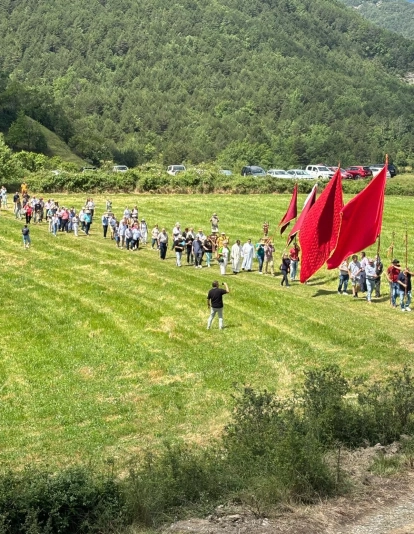 Los feligreses se reunieron en la fuente del pueblo para iniciar la procesión y desfilaron con las emblemáticas cruces y banderas de Albella, Planillo, San Felices, Lacort, Jánovas y otros pueblos vecinos. Acompañada por campanas, chiflo, gaita y salterio, el desfile transcurrió entre prados hacia la ermita de San Úrbez, con los ancestrales gozos al santo.