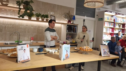 El cocinero oscense Mateo Sierra presentó su último libro, “Repostería sin gluten”, en un acto en la librería Santos Ochoa, donde realizó una de las recetas del libro, un bizcocho de plátano y cacao en taza al microondas, y lo acompañó con una degustación de buñuelos de viento, profiteroles y empanadico de calabaza.