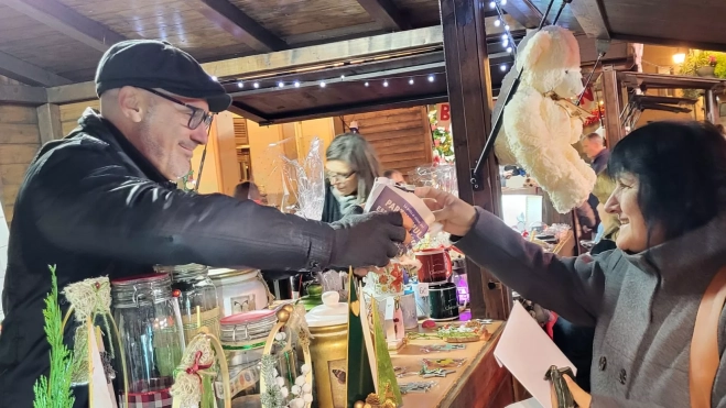 Down Huesca aporta al mercado una variada colección de adornos festivos. Andrea Otal destaca la presencia de renos elaborados con piñas, muñecos de nieve, velas de distintos formatos, árboles decorativos y otros enseresd preparados en Carpintería Castellar, piezas muy demandadas por quienes buscan un obsequio original y solidario.