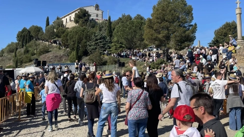 Los romeros, una vez han llegado a la explanada de la Cruz, han disfrutado del reparto de longaniza, roscón y vino y la actuación de Aires Monegrinos. Mientras, el camino era un hervidero de gente que subía y bajaba de la ermita, en la que tocan la campana y pasan por el camarín de la virgen.