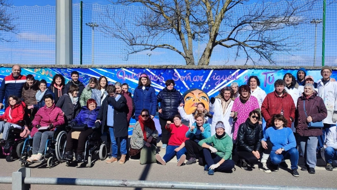 Un numeroso grupo de personas vinculadas a Asapme Huesca, Aspace , ASZA y la Casa Familiar San Lorenzo de Hermanos Francisanos de Cruz Blanca se reunieron el pasado viernes frente al muro del Campo de Fútbol San Jorge para participar en la pintura de “El mural de todas”. Dirigidos por la artista Susoleto, las palabras y dibujos plasmados en él giran en torno a un deseo, expresado de manera contundente en la frase: “Queremos soñar igual que tú”, lema elegido este año para celebrar el Día Internacional de la Mujer.