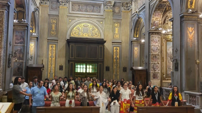 Punto imprescindible de los 68 jóvenes de la diócesis, como de los miles de españoles y el casi millar de aragoneses, es la visita a la iglesia española de Santiago y Monserrat, donde el rector, José Jaime Brosel, ha ejercido de anfitrión con las explicaciones pertinentes para que cada uno de los participantes disfrutara en plenitud de vivencias singulares.