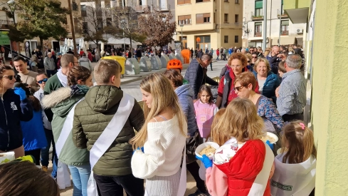 La plaza del Justicia de Huesca ha sido este domingo desde el mediodía el corazón de las fiestas de San Martín, con numerosos oscenses que se han acercado a disfrutar de la tradicional comida popular a base de migas y la fiesta que ha organizado Huesconswing.