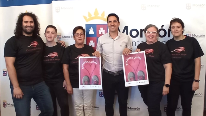 El concejal de Deportes, Eliseo Martín, y la presidenta, Ana Falo, y vocal, Beatriz Sanchis, de la Asociación de la Carrera de la Mujer de Monzón, han presentado este lunes en el Salón Azul del Ayuntamiento la VIII edición del evento, que espera reunir a 1.000 participantes con el fin solidario de donar la recaudación al Instituto de Investigación Sanitaria Aragón (ISS Aragón) y una asociación de la ciudad, que está todavía por concretar.