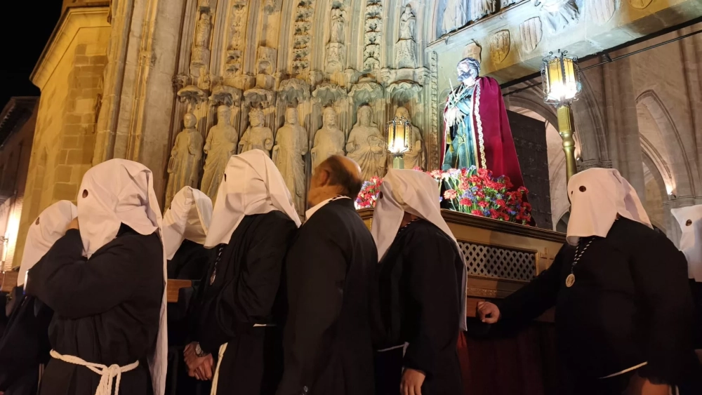 El grupo de cajones recibía la salida del Cristo con ritmos de respeto y devoción. A un lado, en actitud respetuosa, representación institucional con la alcaldesa, Lorena Orduna, y varios concejales. Han partido por delante los estandartes de las distintas cofradías, liderados por el de la titular procesional. La percusión recibía la salida de la Catedral de los representantes cofrades, con sus túnicas y sus capirotes, terceroles y cíngulos. El prior, Manolín Giménez, ha aguardado en la puerta a la llegada de la escultura policromada de dos centurias de antigüedad