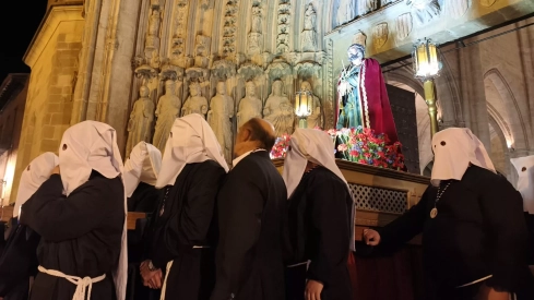 Manolín Giménez ordena otra levantá. "Va para Isabel, va al cielo". Y la procesión va dejando lenta y cadenciosamente la Catedral para el recorrido que comienza por la calle y sigue por San Salvador, Mozárabes, Plaza de Los Fueros, Santos Justo y Pastor, Desengaño, Doña Petronila, Las Cortes y retorno a la Iglesia Catedral.