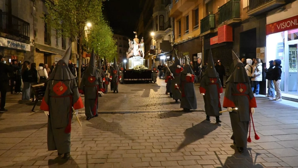 Son las once de la mañana y parte de la plaza junto a la parroquia para encarar el Coso Bajo y descender por Sancho Ramírez, donde las estrecheces todavía contextualizan más el sentido de la circunstancia que se celebra. Se abre el espacio con Travesía Ballesteros y la calle José María Lacasa, para enfilar la calle Lanuza. Más de una hora después del inicio, ya está en el Coso Bajo nuevamente para terminar en Santo Domingo. Suena triste la gaita para homenajear a una difunta de la cofradía, Sandra, en medio de los sollozos humanos y la trascendencia de la fe. Último toque y final de la procesión. Cristo está apresado. La suerte está echada. A partir de aquí, continúa lo que ha de venir con las palabras premonitorias del Cristo que presagia el cumplimento de lo que escribieron los profetas.