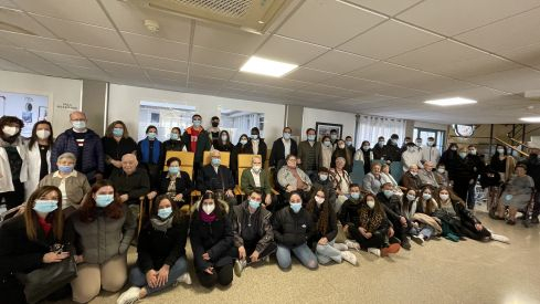 Los mayores han entregado un detalle a los acompañantes delante del alcalde, Isaac Claver, el presidente del Patronato de la Residencia Riosol, Salvador Sarrado, la directora del centro, Valentina Vilarrubí, y docentes de Salesianos con el director titular, Antonio Campo, y la directora del equipo pedagógico, Anabel Novellón, al frente.