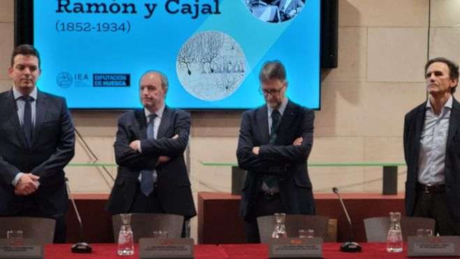 José María Pérez Trullén, jefe de la Sección de Neurología del Hospital Royo Villanova, Alberto Jiménez Schuhmacher, investigador ARAID en el Instituto de Investigación Sanitaria Aragón, y José María Serrano Sanz, catedrático de la Universidad de Zaragoza, han revelado la transversalidad de Santiago Ramón y Cajal que confluye en su concepto de transformación del mundo y de España. El director del Área de Biomedicina del Instituto de Estudios Altoaragoneses, Juan Blas Pérez Lorenz, ha dirigido el acto que ha sido abierto por la vicepresidenta de la Diputación Provincial, Elisa Sancho.