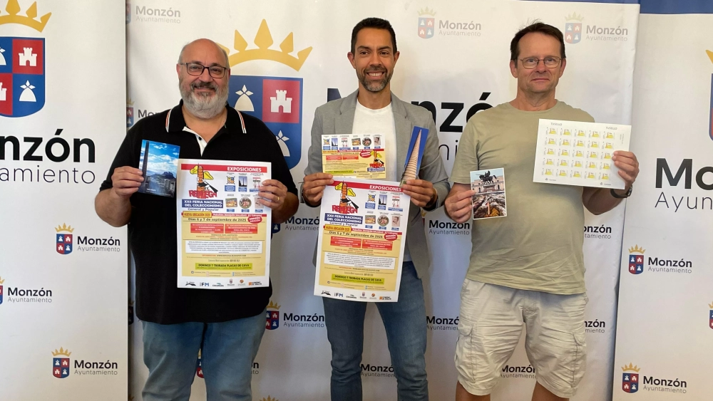 El concejal de Institución Ferial de Monzón, Jairo Sánchez, el director de Replega, José Luis Escutia, y el presidente del Grupo Filatélico Joaquín Costa, Joaquín Palacios, han presentado en el Ayuntamiento de Monzón la XXII edición de la Feria Nacional del Coleccionismo General y Popular (Replega), que se celebrará el 6 y 7 de septiembre en el Pabellón Joaquín Saludas con la previsión de asistencia de más 5.000 coleccionistas.
