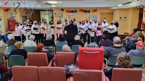 La Residencia Sagrada Familia de Huesca, que cuenta con 83 usuarios, ha celebrado este lunes su fiesta navideña con la participación de los componentes del coro “Voces de la alegría” y del grupo de baile en línea del Hogar de Mayores de Huesca. Tanto residentes como usuarios de este centro, ambos del Instituto Aragonés de Servicios Sociales (IASS), han asistido a esta celebración llena de música, que han coreado, bailado y aplaudido.