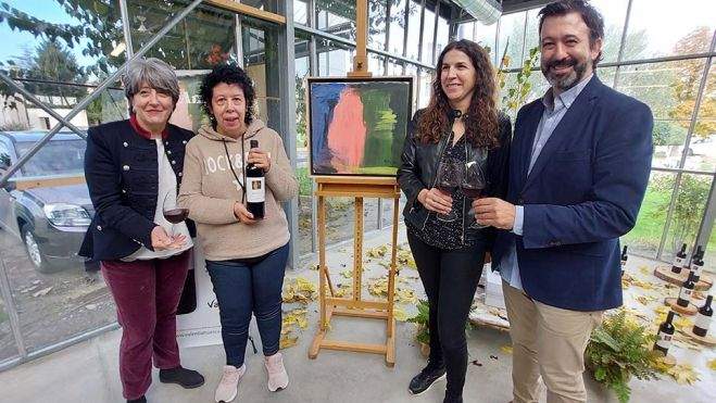 Rocío Suárez, la autora, la artista, ha salido con el desparpajo que le caracteriza. "Para mí es un honor. Este vino representa a Enate, que es un pueblo de la provincia de Huesca, que está cerca de Barbastro. Cuando fuimos a la bodega, me gustó mucho pisar la uva. ¿Qué es la uva? Lo que está debajo de la parra. La coges, la cortamos con las tijeras podadoras con mucho cuidado de no romper la uva... Os quiero presentar este maravilloso cuadro que está a mi lado y que significa naturaleza. La naturaleza es que los colores que he hecho yo sean naturaleza, y estoy orgullosa de haberlo hecho. Han venido mi madre y mi tía y estoy orgullosa".