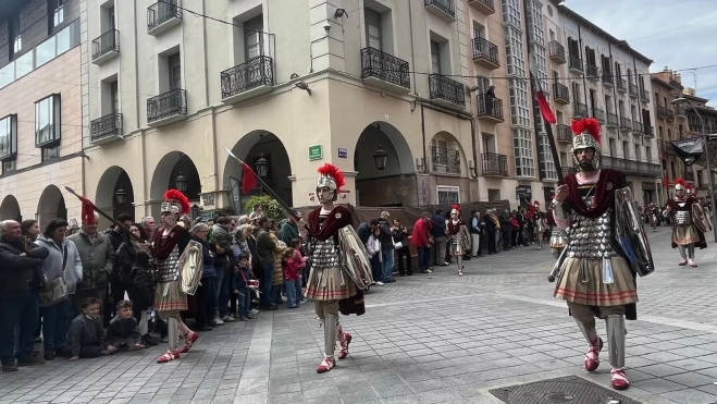 El paso firme de los soldados y caballos han vuelto a marcar uno de los momentos más esperados de la Semana Santa de Huesca. Como cada Viernes Santo, a las 14.00 horas, los Romanos han comenzado su desfile recorriendo la calle Santiago, Pedro IV, la plaza de Lizana y el Coso -recuperando el paso por el Coso Alto tras las obras- hasta llegar media hora después a la plaza de Santo Domingo, donde las bandas de tambores y bombos de las cofradías les han recibido con su toque. Numerosos oscenses se han sumado al recorrido y han llenado las calles del centro para acompañar a los soldados en uno de los desfiles más arraigados de la ciudad.