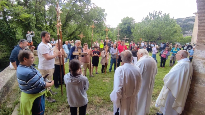 Las Cruces de Panzano, Santa Cilia, Aguas, Coscullano, Sipán, Loscertales, Almunia del Romeral, Castejón de Arbaniés y Arbaniés han ascendido hasta la ermita de San Cosme y San Damián, que los peregrinos han rodeado el templo al no poder acceder a la Fuente Santa por estar cerrada por obras, para disfrutar de la romería de San Gregorio.