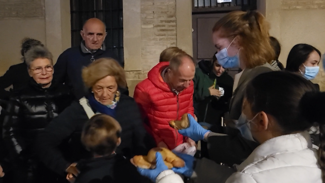 En algo menos de media hora, el público que ha acudido a la plaza de Santo Domingo ha disfrutado de 70 kilos de patatas y 40 kilos de pan, acompañadas de vino y refrescos, que han repartido las mairalesas y miembros de la Comisión de Fiestas.