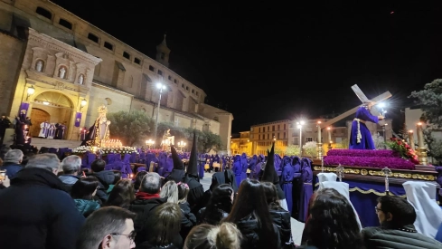 Barbastro ha celebrado una de las procesiones más profundas y emocionales de su Semana Santa: el Santo Encuentro, organizado por la Cofradía de Nuestro Padre Jesús Nazareno. Una noche de aspecto trascendental, elevado, que arrancaba a ls 22 horas desde la Iglesia de San Francisco con los conjuntos de "Jesús Nazareno", "La Virgen de la Amargura" y "La Verónica", arropados por cientos de personas expectantes que han presenciado la salida y orado en el rezo de la segunda estación del Viacrucis en las mismas puertas del templo.