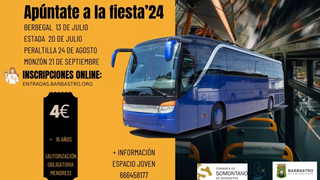 El servicio de autobús que el Ayuntamiento de Barbastro, a través de su área de Juventud, retoma este año para conectar la capital de El Somontano con localidades de la propia comarca y de territorios vecinos durante las fiestas patronales de éstas ha cubierto ya un 43% de las 212 plazas ofertadas en las cuatro expediciones dispuestas (Berbegal, 13 de junio; Estada, 20 de julio; Peraltilla, 24 de agosto y Monzón, 21 de septiembre). Con el servicio, y a cambio del pago de un billete de ida y vuelta que cuesta 4 euros por persona, se brinda una alternativa de ocio seguro a los más jóvenes de la ciudad al tiempo que se refuerzan y fomentan los vínculos de la juventud barbastrenses con los jóvenes de otras poblaciones, con quienes comparten en muchos casos centro escolar. El programa, denominado Apúntate a la Fiesta, se activa desde la concejalía de Juventud que lidera Pilar Abad.