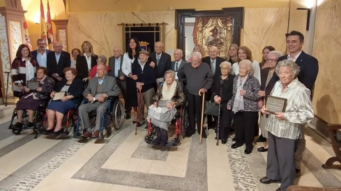 Esta es la hermosa alineación que esta mañana se ha congregado junto al escudo imperial. Con 100 años de edad, Enriqueta Vilacampa Murillo, María Ángeles Ferraz Ferrando, Gonzalo Otín Calvo, y Pilar Cebollero Almudévar. De 101 han asistido Antonio Burrell Galindo, Vicente Gómez Nogarol, Antonio Lles Malo, Resurrección Cored Susín y Pascual Domec Elpuente. Con 102 años, Cecilia Boira Gella, Isabel Mur Bergasa y José García Sañudo. De 103, Ligia Ubieto Artero. Y, finalmente, con 105 años, siendo además el más anciano de Huesca, Tomás Castán Malo.