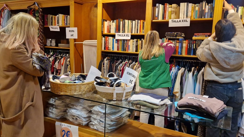 "Tenemos toda la ropa ordenada en las perchas, la de niños a 2 euros; pantalones también a 2 euros y tres piezas a 1 euro" detalla Josefina, mientras organiza cuidadosamente las prendas. El mercadillo está perfectamente ordenado por tallas, lo que facilita que los visitantes encuentren lo que buscan.