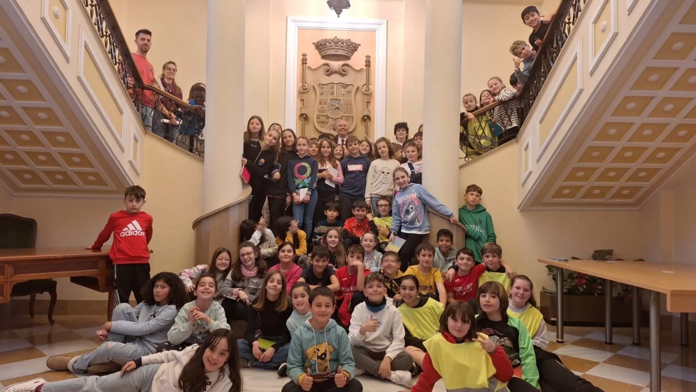 El subdelegado del Gobierno en Huesca, Carlos Campo, y la secretaria general de la institución, Amparo Roig, dieron la bienvenida a los más de 60 niños y niñas que recorrieron la sede del Gobierno de España en la provincia.