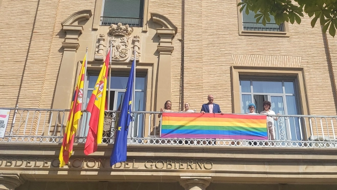 La Subdelegación del Gobierno en Huesca ha acogido este lunes la recepción a la Asociación 28J con motivo de la celebración del Día Internacional del Orgullo LGTBIQ+, que se conmemora el próximo 28 de junio. Tras el encuentro, se ha colocado en el balcón principal la bandera arcoíris, que lucirá durante los próximos días como símbolo del compromiso institucional con la diversidad y la igualdad.