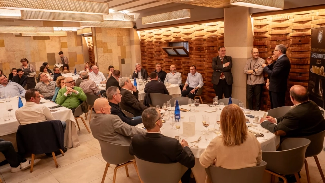 En la mesa presidencial, figuraban las máximas autoridades provinciales y locales. Isaac Claver, presidente de la Diputación que expresó su compromiso con la gastronomía como pilar de atracción turística y como fuente de innovación para la identidad. El alcalde de Barbastro, Fernando Torres, reivindicativo de los productos de la fértil huerta y de los magníficos viñedos de la ciudad y de la comarca. Fernando Luna, presidente de CEOE-Cepyme Huesca, que tras la comida recordó que cada comensal nos habíamos "comido 14.500 litros de agua" precisa para el cultivo de los alimentos. Carmelo Bosque, presidente de la Asociación, que habló de la industria de la felicidad que es la restauración y apostó por proyectos audaces y punteros. También su predecesor, Juan Ignacio Pérez, ahora en papel de "coach", que remarcó la relevancia de esta parte del turismo. Y, naturalmente, el de siempre, el creador de la idea, José Antonio Pérez, que puso su fina capacidad de cata al servicio de la ilustración de los presentes.