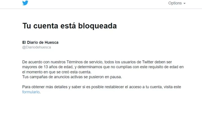 La red social Twitter ha bloqueado la cuenta de EL DIARIO DE HUESCA desde el pasado 16 de agosto porque determinó que "no cumplías con este requisito de edad" de 13 años "en el momento en que se creó esta cuenta".
