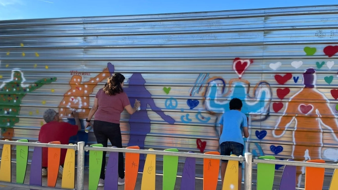 La Plaza de las Culturas de Huesca se convirtió este jueves en un lienzo vivo donde la creatividad y la comunidad se fundieron en un nuevo acto enclavado en la segunda edición de Barriofest. Bajo las indicaciones de Edgar Camarero, también conocido como "Gozas", se llevó a cabo un proyecto de mural colaborativo, muy bien acogido por el vecindario.