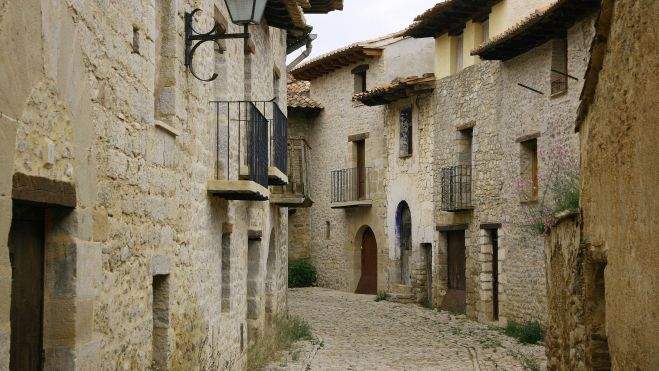 Y entre páramos, donde el llano apenas adquiere relevancia, porque es breve y ondulado, en un territorio árido, áspero y de tonos amarillentos, se esconde Mirambel. Es un pueblo amurallado y de remembranzas pretéritas, que ha sido inteligentemente restaurado, mereciendo el premio internacional “Europa Nostra”. El empedrado de las calles es muy interesante y está en armonía con los muros a piedra vista de las casas, unas de mampostería por hiladas a la rústica y otras, las más suntuosas, de sillares labrados a obra isódoma. Muchos edificios son de rancio abolengo, en los que resaltan las artísticas labores hechas en las maderas nobles de los aleros.