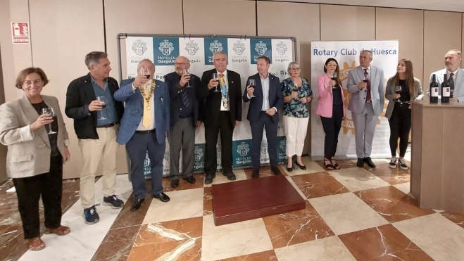 José Luis González, que en estas lides se estrenaba como presidente, ha recordado los quince años de maridaje del Rotary y de Enate. Aunque ajustado en el uso del verbo, tras la erudición histórica en torno a las medidas del vino en Francia e Inglaterra, ha concluido que los galones que cada persona podrá llevarse a su casa (seis botellas, 50 euros) obedecen a una coherencia ética amparada en tres razones: la fabulosa calidad del vino de Enate, la condición artística de las etiquetas de artistas locales entre las que en estos tres lustros han figurado dos rotarios (Eduardo Cuello y Julio Luzán) y la magnitud de la causa de esa familia de 1,2 millones de socios que han reducido la poliomielitis de 350.000 afectados en 1988 a 33 hace apenas un lustro, concentrados estos últimos exclusivamente en Afganistán y Pakistán. En la búsqueda de "socios activos", expresión muy al uso del club, ha agradecido a la Sociedad Deportiva Huesca representada por Josete Ortas el apoyo del Femenino a las acciones solidarias que se desarrollarán en los próximos meses, entre ellas el gran acto de la Paz.