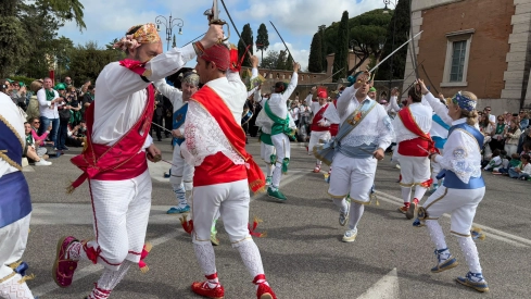 Fuera los nervios, exultantes los corazones, los Danzantes se han lanzado con el escaso tiempo contemplado (veinte minutos) a convertir el dance en oración bajo los sones de la Banda de Música de Huesca y entre la expectación de oscenses desplazados a Roma y visitantes estos días de todo el mundo que se suman a los italianos en el dolor y esperanza tras la muerte de Francisco I. Ha sido una actuación breve, contenida, con reapariciones como la de Jesús Esperanza en homenaje a su hermano