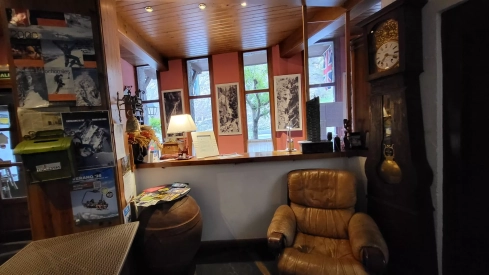 Precisamente, es la armonía una de las primeras sensaciones que impactan cuando se aparca el vehículo, con las vistas hacia la carretera a Cerler en el final de la Avenida de Francia. La recepción es una preciosidad, más propia del gusto refinado de antaño que del minimalismo impersonal de hogaño. Butacas que invitan a hundirse en su mullida promesa, relojes de pie de época, una barandilla de madera para la subida y una puerta de fondo realmente hermosa.