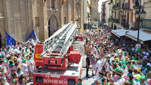 Tras media hora, entraba desde el Coso a la plaza de San Lorenzo un camión de bomberos para proceder en su cesta a elevar a los protagonistas. Tras la preparación, sobre las 14:45, Carmen y Antonio han podido llegar hasta la imagen de San Lorenzo y ponerle la pañoleta, mientras los peñistas vitoreaban el momento con la misma emoción del principio.